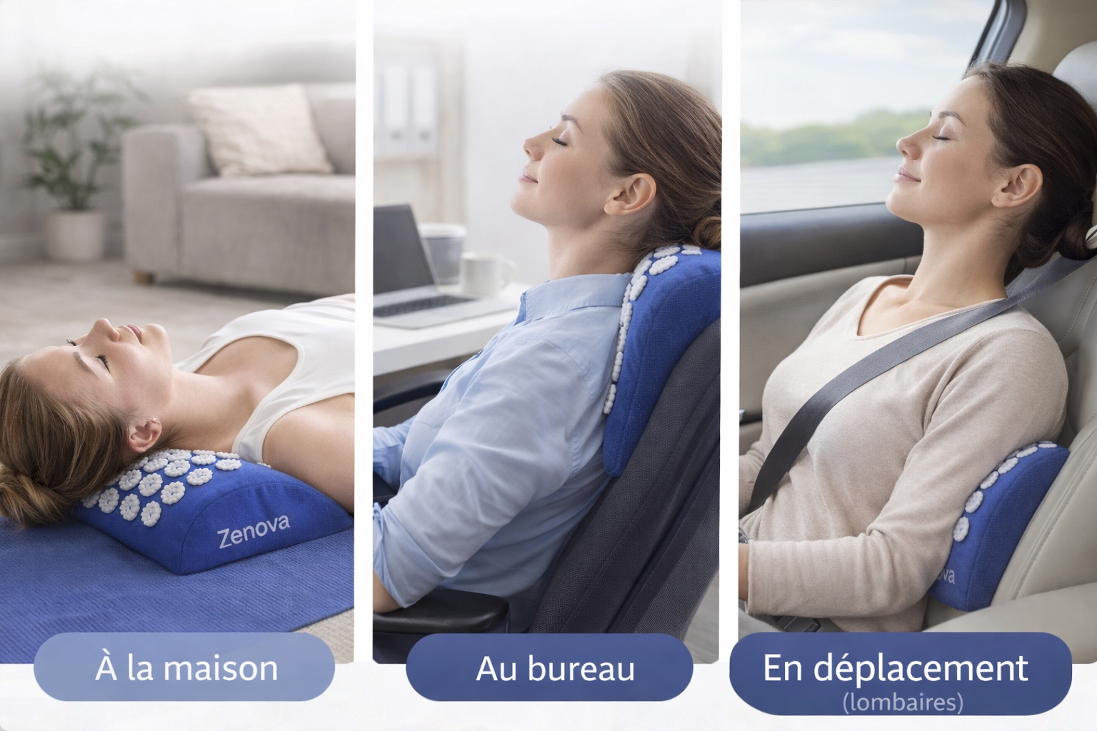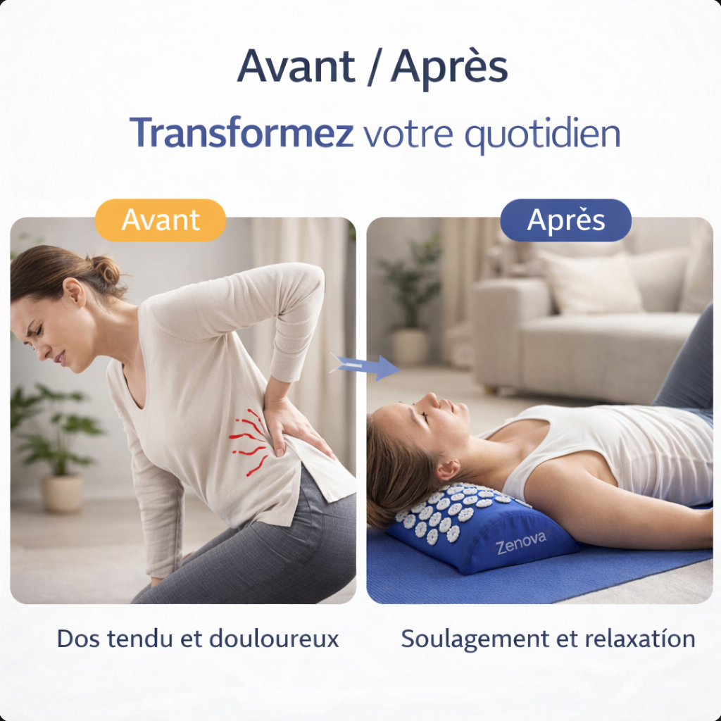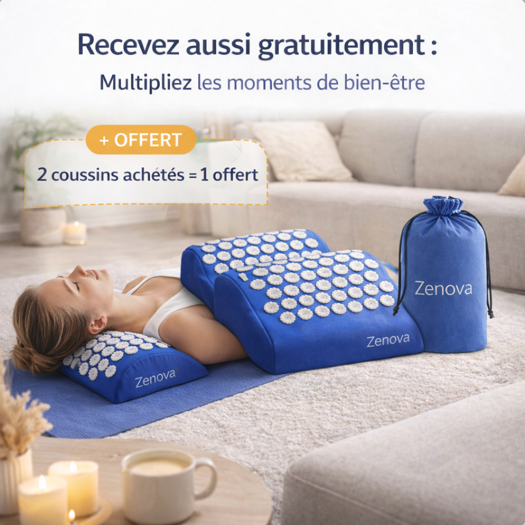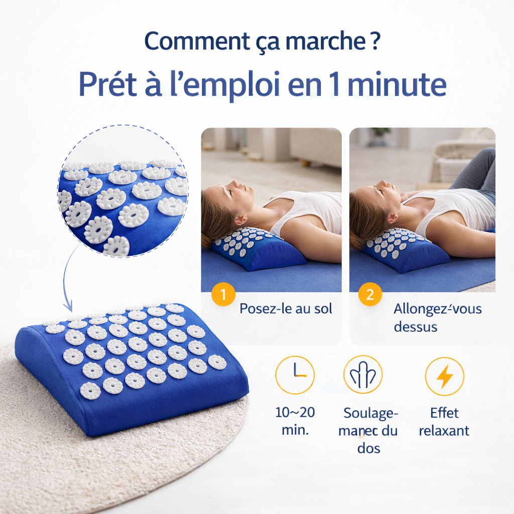 Le coussin est conçu pour soutenir la nuque, le cou ou le bas du dos. Il complète parfaitement le tapis pour une relaxation plus ciblée et un meilleur confort.